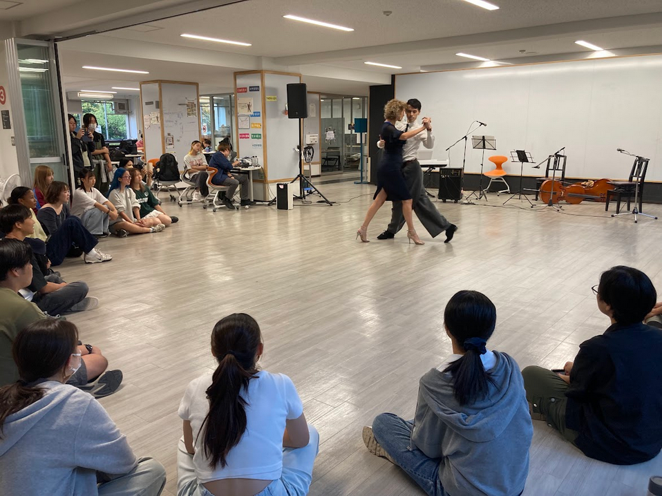 イベントの内容としては、まずタンゴの歴史を学び、簡単なタンゴのステップを習得したところで、音楽選択の生徒の方々の演奏に合わせてみんなでタンゴダンスを踊りました。最後には、ダンサーのお二人の貴重な生パフォーマンスを見ることが出来ました。